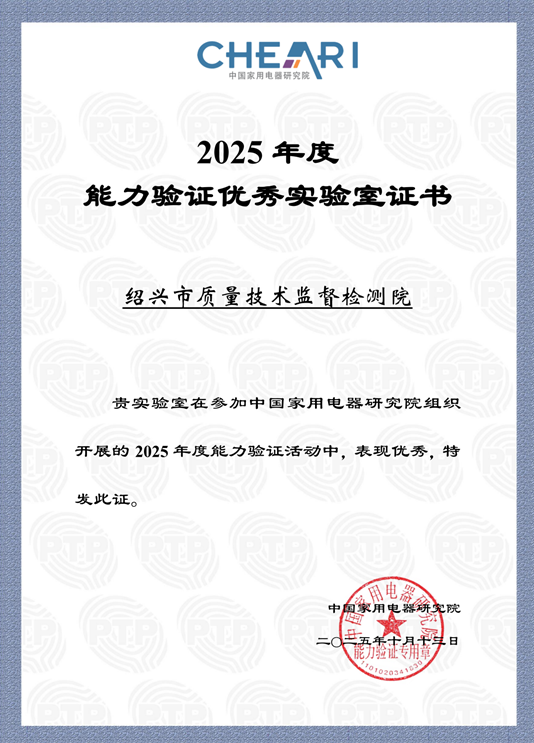 news绍兴质检院荣获“能力验证优秀实验室”证书 近日,绍兴质检院在由中国家用电器研究院组织实施的“